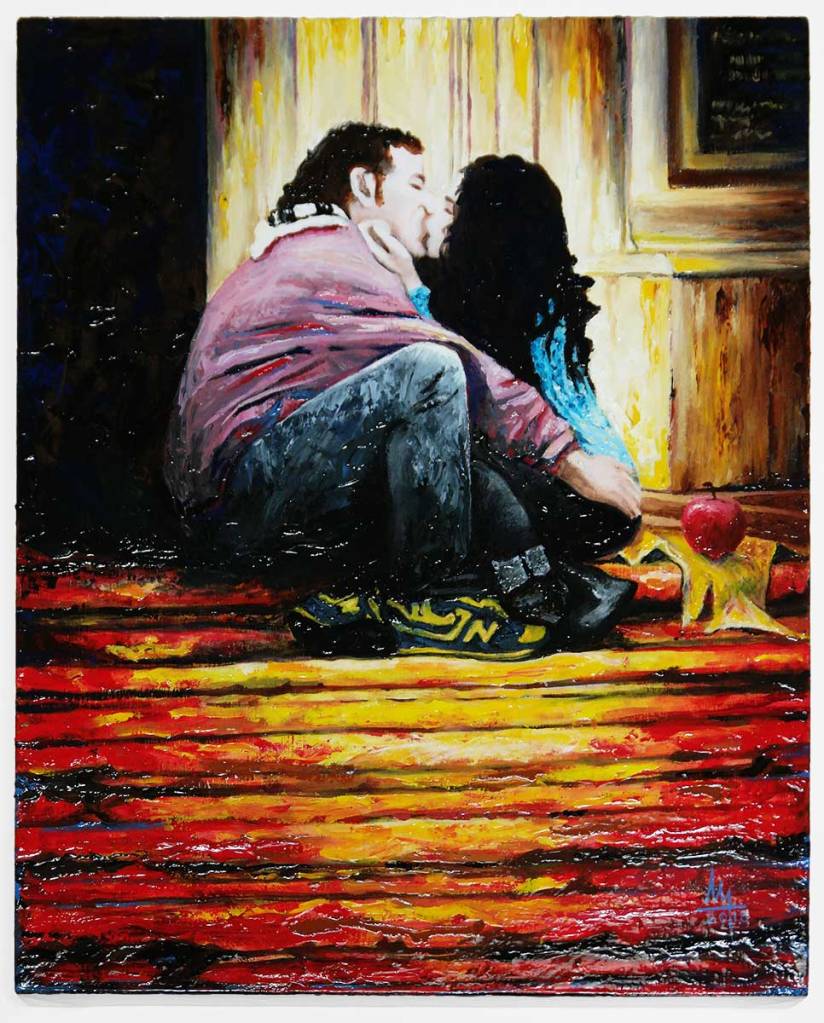 The painting itself is as impastoed as I could accomplish given the details I wanted to capture within the canvas size I used. Attention is drawn to the kiss itself – an area where the impasto fades from view, the increased white nearly serving as a spotlight – with surrounding reds intended to convey romantic passion and with yellows intending to convey a core sentiment of agape. Though somewhat subtle, further symbolism includes the apple by her side – representing her gift of spiritual knowledge – while the darkness serving as a background for him was meant to draw one’s emotive attention to hidden depths and mystery.